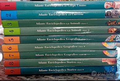 Atlante enciclopedico 9 volumi - Corpo umano - Universo - Animali 2 volumi - Geografico 3 volumi - Storico 2 volumi Descrizioni dettagliate, testo discorsivo, bellissime immagini ottimo stato