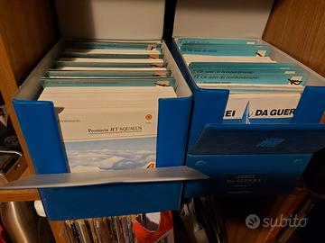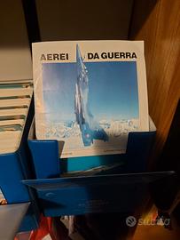 Aerei da guerra di tutto il mondo, 1914-1990 circa. Collezione delle 1936 schede tecniche illustrate a colori, cm 14,7x14,7. Bombardieri, caccia, aerei da addestramento, ricognizione, trasporto e collegamento, elicotteri, idrovolanti, aerei da guerra elettronica, duelli aerei, assi dell'aviazione ecc. Le schede sono ordinatamente classificate in due robusti contenitori schedario originali in plastica azzurra, con separatori per tipo di aereo