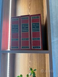 "Trattato Italiano di Patologia Chirurgica" a cura di Galeno Ceccarelli, edito da Piccin. È un'opera enciclopedica di medicina, in particolare di chirurgia. L'editore è Piccin, come riportato nella parte inferiore dei dorsi. L'autore, o curatore, è Ceccarelli, il cui cognome è visibile nella parte superiore di ogni volume. Usabile anche come arredamento. Ci sono circa 20 pagine come indice e non riesco a inserirle tutte