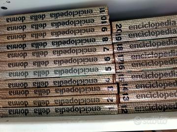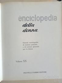 # ENCICLOPEDIA DELLA DONNA: GRANDE ENCICLOPEDIA DI NOZIONI PRATICHE E DI CULTURA GENERALE PER LA DONNA. Milano, Fratelli Fabbri, 1963/64. Opera completa in venti volumi di grande formato di complessive 4598 p. in numerazione continuativa, con indici generale e degli argomenti per ciascun volume e generale dell’opera in coda all’ultimo, 25x31 cm, interamente illustrati a colori. Legatura ed. t. tela marrone con titoli in oro al dorso e al piatto. Ottimo stato. # ARGOMENTI DELL’OPERA: ABBIGLIAMENTO; ARREDAMENTO; ARTI; ARTI MINORI; BIANCHERIA PER LA CASA; BILANCIO FAMILIARE; CARRIERE FEMMINILI; CHIMICA-FISICA; CHIRURGIA ESTETICA; CINEMA; CONSIGLI LEGALI; CORSO DI CUCINA; COSMESI; COSTUME; CUCITO; DIETETICA; EDUCAZIONE CIVICA; EDUCAZIONE DEI FIGLI; ELETTRODOMESTICI; GALATEO; GENETICA; GIARDINAGGIO; GINECOLOGIA; GINNASTICA ESTETICA; GIOIELLI E BIGIOTTERIE; GLI STILI NELLA CASA; GUARDAROBA; LA DONNA NELL’ARTE; LA DONNA NEL MONDO; LETTERATURA; MAGLIA; MEDICINA; MERCEOLOGIA; MORALE; MUSICA; OSTETRICIA; PASSATEMPI UTILI; PEDIATRIA; PICCOLA FARMACIA; PREVIDENZA E TRIBUTI; PSICOLOGIA; PUERICOLTURA; PULIZIA DELLA CASA; RAMMENDO; RELIGIONE; RICAMO; RICETTE; STORIA; TAGLIO; TEATRO; TURISMO; UNCINETTO; VARIETÀ; ZOOLOGIA. # LA PIÙ COMPLETA ENCICLOPEDIA MULTIDISCIPLINARE PER LA DONNA DEL ’’BOOM’’ DEGLI ANNI SESSANTA.