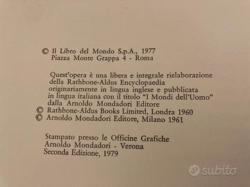 Enciclopedia completa "I Mondi dell'Uomo" edita da Arnoldo Mondadori Milano nel 1977 (seconda edizione) , composta da 12 volumi con copertina marrone e bordature in oro, molto elegante.