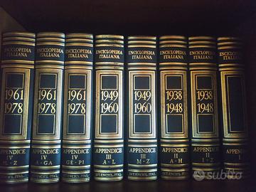 Enciclopedia Italiana Treccani con rilegatura in oro edizione 1949 in perfette condizioni aggiornata fino al 1978. Include 35 volumi con ristampa fotolitica dei volumi pubblicati dal 1929, 1 indice e 8 appendici