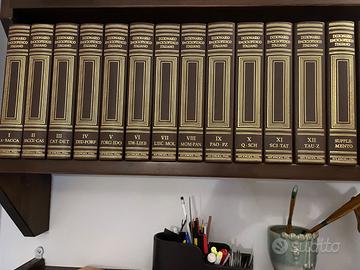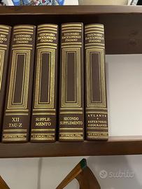 Enciclopedia Treccani colore marrone, completa di dodici volumi più due supplementi di aggiornamento e un volume atlante repertorio geografico.