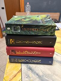 La saga completa costituita da Eragon, Eldest , Brisingr e Inheritance. Eragon, Eldest e Brisingr sono nella versione copertina rilegata mentre Inheritance e’ nella versione economica. Sono in ottime condizioni.