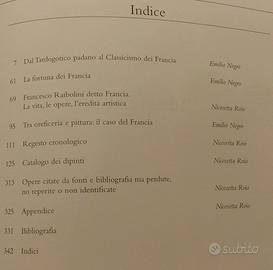 Il tema trattato nel volume riguarda l'opera di Francesco Raibolini, detto "il Francia", pittore di talento e successo del '500. L'artista era eclettico, iniziò infatti la sua attività come orafo giungendo a creare opere pregevoli che gli valsero alti riconoscimenti e fama, passò poi alla pittura subito bene accolta, riportano gli storici, dipingendo opere in modo elegante, compatto e luminoso come ci mostrano i tanti dipinti riportati su questo libro. "Il Francia" era anche colto, raffinato ed aperto alle altre scienze e forse proprio per questo divenne uno fra gli artisti preferiti della famiglia Bentivoglio.