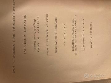 1) Scrittori di Roma: edito dal Sindacato Fascista degli autori e scrittori, a cura di Francesco Sapori con dedica dell'autore a Igino Giordani. Pagine intatte, riccamente illustrato. Diviso in nove parti per complessive 1116 pagine, piu' 100 di pubblicita' dell'epoca. Interessante notare che nelle pagine e' contenuta l'origine del concetto di Dante come fondatore del pensiero di destra recentemente esposto da un personaggio politico,