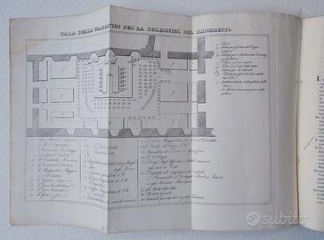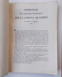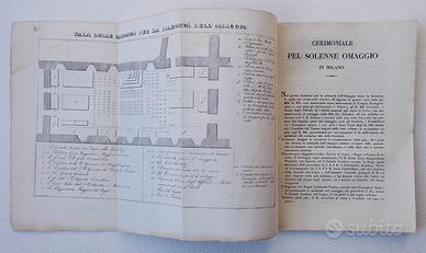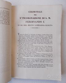 Il 6 settembre del 1838 fu il giorno dell’incoronazione di Ferdinando I d'Asburgo-Lorena a Re del Regno Lombardo-Veneto. Grandioso e solenne, l’evento si articolò in sette fasi: 1. Ingresso Solenne dei sovrani a Milano, che prevedeva l’accoglienza da parte delle massime autorità cittadine e il passaggio sotto archi trionfali. 2. Omaggio Solenne nella Sala delle Cariatidi del Palazzo Reale, dove le deputazioni del regno prestavano giuramento di fedeltà all'imperatore. 3. Trasporto della Corona Ferrea da Monza a Milano. 4. Andata alla Metropolitana ovvero il corteo ufficiale che conduceva i sovrani dal Palazzo Reale al Duomo di Milano (la "Metropolitana") per la cerimonia religiosa. 5. Rito dell'Incoronazione, durante il quale la Corona Ferrea veniva posta in capo Ferdinando I. 6. Banchetto dell'Incoronazione ossia il ricevimento di gala conclusivo. 7. Visita del Re alla basilica di sant’Ambrogio. Ogni fase era regolamentata da un elaboratissimo cerimoniale, pubblicato nel 1838 dall’Imperial Regia Stamperia di Milano in 7 documenti a stampa racchiusi in un fascicolo in brossura, intitolato “Cerimoniali per la solennità dell’incoronazione di S. M. I. R. A. Ferdinando I in Re del Regno Lombardo-Veneto”. Oltre al testo descrittivo dei cerimoniali, la pubblicazione contiene 3 tavole incise su rame e ripiegate all’interno del fascicolo. La prima tavola è una mappa della Sala delle Cariatidi, con l’indicazione delle posizioni occupate nella Sala dai partecipanti all’omaggio. La seconda descrive il luogo dell’incoronazione con le posizioni occupate dagli officianti e dagli astanti. La terza tavola è la mappa della sala in cui si svolge il banchetto con l’indicazione di tutti i posti assegnati. L’esemplare qui proposto è completo di tutte le sue parti, comprese le tre tavole. Difetti: oltre alle normali usure del tempo, si rilevano macchie di umidità, bruniture e una lacuna al piatto inferiore della copertina.