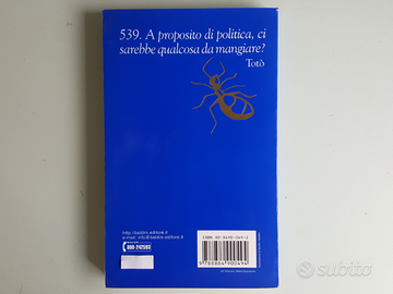 CONTENUTO: "Anche le formiche nel loro piccolo si incazzano" è un titolo rubato, come rubate sono tutte le battute (esattamente tremila) di questo ultimo volume che sintetizza le raccolte precedentemante pubblicate. Completano il volume tre indici ragionati: quello biografico per saperne di più sui padri della battuta, quello degli autori e quello delle battute per argomenti.