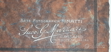 Interessante fotografia di un importante funerale, (bandiera del Fascio locale e altro tricolore), di grandi dimensioni riportata su cartoncino colorato e con marchio ditta Arte Fotografica Finatti di Bassano. Buone condizioni, cm. 17 per 12,5 cm. Misure del cartoncino cm. 25,5 per 15,8 cm.