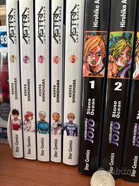 Vendo i numeri dei fumetti in foto, tra cui JoJonium volume 1, alcuni volumi di JoJo sesta stagione, Attacco dei giganti e Astra
