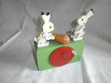 Soggetto : 2 coniglietti che segano una carota ; girando la manovella i 2 coniglietti si muovono e contemporaneamente suona il Carillon.