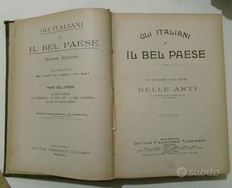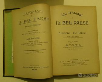 Gli italiani e il Bel Paese. Piano dell'Opera: "Storia politica" di P.Orsi e due appendici di G. Cappello e A. Avancini. "La letteratura" di P.E. Guarnerio, "Belle arti" di U. Fleres e L. Callari, "La cultura scientifica" di F. Rizzatti, "Vita e costumi" di D. Carraroli. Milano, Vallardi, 1925. 5 parti in 6 volumi in 4° ; pp 4028 + 2700 illustrazioni complessive. Bell’esemplare in tela editoriale, titoli in oro ai piatti.