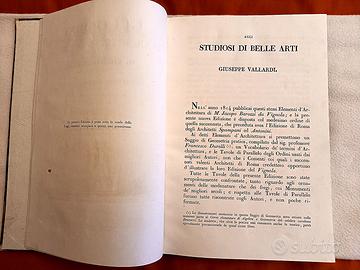 "Gli ordini di architettura" di Jacopo Barozzi, detto il Vignola, edizione del 1832 a cura della casa editrice Vallardi. Il libro si compone di 100 pagine a cui bisogna aggiungere 44 tavole. Dimensioni 31x21 cm circa. Le condizioni sono buone, in alcune pagine è presente qualche zona ingiallita dal tempo, senza che sia minimamente pregiudicata la lettura. Non vi sono strappi nè parti mancanti. Alcune tavole (vedi fotografie) riportano appunti scritti a matita. Le tavole 4/5/6/7/8 non sono direttamente stampate, ma risultano apposte sulla pagina.