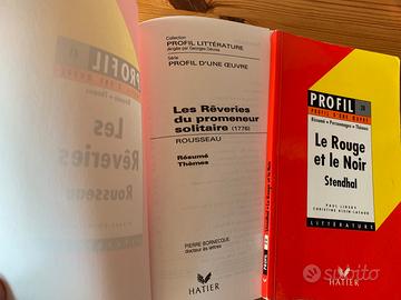 Vendo due guide allo studio della letteratura francese della casa editrice Hatier/ Profil: "Les reverire " di Rousseau e "Le Rouge et le noir" di Stendhal. 10 euro per entrambe o 6,00 l'una. Copertina morbida, in lingua francese.