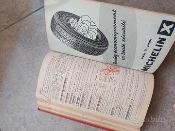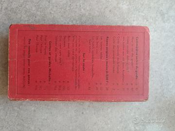 1959 deGuida Michelin Francia. rcrata dai fratelli Michelin per incoraggiare i viaggi in auto e, di conseguenza, aumentare la vendita di pneumatici.Include mappe, informazioni su garage, stazioni di servizio e valutazioni di hotel e ristoranti.Il sistema di stelle introdotto nel 1931 valuta la qualità dei ristoranti. oggi è un oggetto da collezione popolare tra gli appassionati di automobilismo e gastronomia. Traduzione 1959 Michelin 950 F FRANCIA Ecco la chiave della Guida... IL COMFORT (vedi p. 19) degli HOTEL di gran lusso di lusso molto confortevole di buon comfort semplice, abbastanza confortevole molto semplice ma conveniente dei RISTORANTI [simboli] di gran lusso di lusso [simboli] molto confortevole [simboli] di buon comfort [simboli] semplice, conveniente [simboli] molto semplice ma conveniente Gli stabilimenti accoglienti sono segnalati in rosso (vedi p. 18) LA QUALITÀ DELLA TAVOLA (vedi p. 32) [simboli] vale il viaggio - merita una deviazione - buona tavola Pasti curati a meno di 850 franchi (vedi p. 38) I PREZZI (vedi p. 14 e 16) PNEU MICHELIN SERVIZI DI TURISMO [Indirizzo/Telefono] pezzo da collezione pagine imbrunite integre