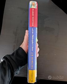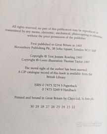 "Harry Potter and the Philosopher’s Stone" di J.K. Rowling, prima edizione Bloomsbury 22a stampa in buone condizioni. Ci sono alcuni piccoli strappi sulla sovraccoperta e c’è un’iscrizione sulla prima pagina bianca (vedi foto). A parte questo, le pagine sono pulite e la sovraccoperta non è scolorita sul dorso. Sto vendendo anche altri libri vintage!