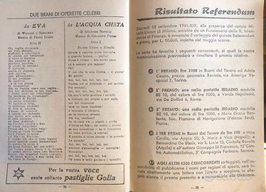 Libretto "Il CANZONIERE della RADIO" - EDIZIONE DEL 1 OTTOBRE 1941 - 21ESIMO FASCICOLO - Dimensioni 12 x 17 cm. Contiene 38 testi di canzoni dell'epoca. Contiene spartito della canzone "Bellezza mia" parole di Bertini-Penati - Musica di M. Schisa. Contiene lezione di fisarmonica di Kramer-Ripa.