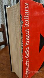 Dizionario compreso di custodia in cartone, parte laterale è parzialmente rovinata, soprattutto la custodia, leggermente meno la sovraccoperta ed ancora meno la copertina. Internamentela copertina risulta leggermente staccata dal resto del libro, i vari stati sono tutti visualizzabili in foto.
