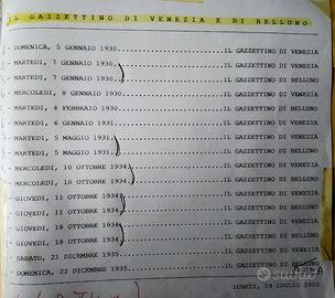 16 copie de il Gazzettino di Venezia e Belluno (da 2 pagine, 4 facciate ciascuna) risalenti agli anni '30 del '900, integre, in buone condizioni, solo piegate e ingiallite. Dettaglio copie sull'ultima foto. Vendo in blocco a 3 € cadauna.