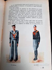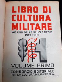 Interessante copia d’epoca fascista del “IL LIBRO DI CULTURA MILITARE – VOLUME I” scritto da Autori Vari ed edito nel 1938 dal “Consorzio Editoriale per la Cultura S.A. - Palermo” ad uso delle scuole medie inferiori. Il testo in argomento, che reca anche un timbro coevo “a secco” nella contro-pagina di presentazione, con la seguente dicitura “SOCIETÀ ITALIANA DEGLI AUTORI ED EDITORI” (“SIAE” dal 1926 al 1942”) con proprio logo epocale al centro, si compone di ben 254 pagine con disegni ed illustrazioni d’epoca a colori e presenta la rilegatura in brossura. Importante “fonte materiale” di come al tempo vi fosse, fin dalle scuole medie, una sensibilità del popolo italiano verso le sue Forze Armate e di Polizia militari, in particolare, lo stesso chiarisce anche oggi ai lettori, in maniera “dettagliata”, “puntale” ed “esaustiva”, come fossero quest’ultime divise ed organizzate. L’interessantissimo cimelio cartaceo, a parte qualche segno del tempo, come una superficiale spellatura sul dorso della sovraccoperta, posta sulla parte inferiore e un “corretto” ingiallimento in alcuni punti delle pagine all'interno del testo, versa in “OTTIME” condizioni di conservazione, senza ne distacchi dalla costola, pagine strappate e/o mancanti o scritte sulle stesse. Misure: 215 mm x 140 mm x 20 mm.