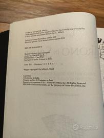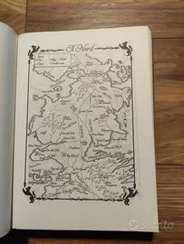 Libro primo, edizione speciale in finta pelle di drago. come si evince dalla prima foto, si può notare una decolorazione del stemma sulla copertina. invece dall'ultima foto si può notare un distaccamento parziale dell'ultima pagina. Niente di eclatante. Per il resto tutte le pagine sono pefette.