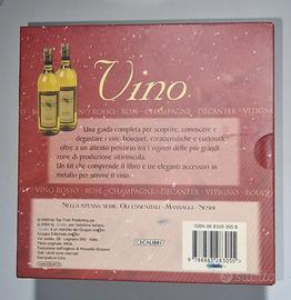 confezione regalo composta da un kit per bottiglie di vino, cavatappi, tappo e anello salvagoccia + libro sul conoscere il vino.