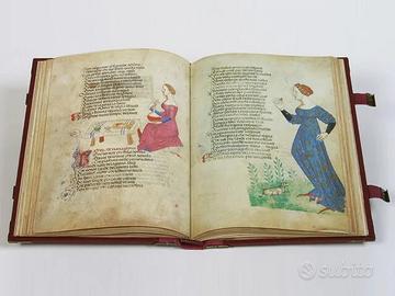 L’Acerba di Cecco D’Ascoli (Acerba aetas). Ms Pluteo 40.52 – Biblioteca Mediceo Laurenziana, Firenze. Editalia, Roma, 2006. Scritto da Francesco Stabili di Simeone, noto come Cecco d’Ascoli, nel 1476 in un volgare umbro-marchigiano arcaico, in forma allegorica vengono trattate questioni naturali, come la proprietà degli animali e delle pietre, concetti filosofici, psicologici, etici e teologici. Commentario (83 pagine ; 20,5×29 cm.) in italiano, a cura di Ida Giovanna Rao, funzionario della Biblioteca Medicea, e di Giordana Mariani Canova, docente di Storia dell’Arte Medievale e Storia della Miniatura all’Università degli Studi di Padova. Legatura in pelle, con cantonali e borchie sui due piatti e chiusura con fermagli. Il Codice e il Commentario sono custoditi in un contenitore a forma di libro.