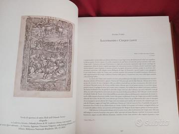 Treccani, edizione limitata esemplare 1355/1999 , pag 764, anno 2014, stampato su carta Scheufelen. Un grande classico della letteratura vive attraverso i secoli, ben 5, mediante la lettura..ma anche e allo stesso tempo in mille forme diverse, ad esempio mediante le immagini e le svariate forme artistiche che ad esso si ispirano. Il libro come è visibile dall'indice è frutto della collaborazione di studiosi affermati coordinati dalla prof. Lina Bolzoni, fondamentale è stata anche la collaborazione con le numerose biblioteche ( vedasi l'eleco riportato ) che hanno accoinsentito a riprodurre numerose pagine delle più antiche e principali edizioni dell'Orlando Furioso. Vi si ripercorrono le vicende delle edizioni dal Cinquecento al Novecento, mettendo, come scrive Bolzoni, " consapevolmente da parte la tradizione secolare che separa la parola dall'immagine, che sancisce la superiorità della prima sulla seconda, e provando a vedere cosa succede quando entrambi sono presenti sotto gli occhi dei lettori, a scandire insieme un lungo percorso, a suggerire di volta in volta determinate prospettive sul testo". Scrive Massimo Bay nella sua presentazione "Vengono, di volta in volta rappresentati i temi essenziali, come l'eros, la follia, la magia, o su come l'immagine cerca di catturare il complicato gioco col tempo che le mille vicende narrate nel poema intessono".