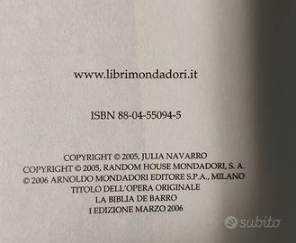 La bibbia d'argilla - Julia Navarro (I Edizione Mondadori) Il coinvolgente thriller archeologico "La bibbia d'argilla" di Julia Navarro, edito da Mondadori. Un'opera monumentale che mescola sapientemente storia, archeologia e spionaggio internazionale. Esemplare in Prima Edizione italiana (marzo 2006), cartonato rigido con sovraccoperta originale. Un libro ideale per chi ama le grandi saghe ricche di misteri storici. Dettagli: Titolo: La bibbia d'argilla Autore: Julia Navarro Editore: Mondadori (Collana Omnibus) Anno: 2006 (I Edizione) Condizioni: Ottime, sovraccoperta integra, pagine pulite. ISBN: 8804550945