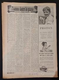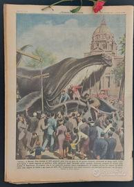 La Domenica del Corriere Anno 55 Nr.41 del 11 ottobre 1953 Supplemento settimanale illustrato del nuovo CORRIERE DELLA SERA Testo in lingua italiana, copertina morbida. Rivista originale completa, presenti sovra copertine Pagina illustrata davanti. La bomba al cobalto contro il cancro. I raggi gamma, gli stessi dell'esplosione nucleare, vengono ora usati per la cura dei tumori maligni mediante le irradiazioni prodotte dal cobalto sottoposto a bombardamento neutronico nelle pile atomiche. Dopo le esperienze fatte in Canada, anche in Italia si sta iniziando tale terapia che richiede complicati e costosissimi apparecchi, uno dei quali è giunto dall'America nei giorni scorsi. (Dis. di W. Molino) Pagina illustrata dietro. “Giona” a Parigi. Una balena di 580 quintali, pari cioè al peso di 15 grossi elefanti, catturata al largo delle coste norvegesi, è stata esposta al pubblico sulla spianata degli Invalidi, nella capitale francese, proprio di fronte alla tomba di Napoleone. Il cetaceo, fra le cui mascelle possono stare comodamente 10 uomini, aveva un fegato di 6000 chili, una lingua di 2000 e un cuore di 420. Per trasportarlo era stato costruito uno speciale autotreno con 10 ruote. (Dis. di W. Molino) Nella rivista: I libri di Verga se li comprava lui Miss Europa: Eloisa Cianni Non sempre il volo umano è stato considerato un’utopia I raggi X: cosa sono, come si usano per la diagnosi e la cura delle malattie Sport: Juventus- fiorentina: perché venne annullato il gol Ecco l’adorata Trieste (pagina illustrata) Napoleone è esistito? L’assassinio dell’imperatore Galba. Condizioni: Buone, con pagine un po’ ingiallite dal tempo. Le pagine potrebbero presentare piccoli strappi e macchie dovute all'uso e alla conservazione nel tempo. Sono presenti alcune annotazioni matita e a penna, che tuttavia non compromettono la lettura. (come da foto) Spedizione: La spedizione della rivista verrà gestita con la massima priorità per garantirne l'invio nel minor tempo possibile.