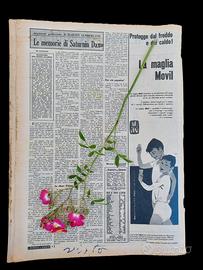 La Domenica del Corriere 16 settembre 1956 Anno 58, Numero 38 Corriere della Sera , Milano, 1956 Rivista originale e completa, in lingua italiana. Copertina morbida. Copertina illustrata (fronte): Matrimonio contrastato a Fiobbio di Albino (Bergamo): poco prima della cerimonia, il fratello della sposa, contrario alle nozze, aggredisce lo sposo Giovanni Capitanio a pugni. L’uomo viene bloccato, mentre lo sposo ferito e la sposa svenuta vengono soccorsi. Dopo mezz’ora, entrambi raggiungono l’altare.(Disegno W. Molino) Copertina illustrata (retro): Drammatica avventura a Basilea: un bambino di 9 anni cade nella fossa degli orsi dopo aver scavalcato la barriera. Un orso bruno lo aggredisce, ma il bimbo si difende finché un custode interviene. I compagni, lanciando carote, distraggono gli altri animali. Il bambino riporta ferite a braccia e gambe.(Disegno W. Molino) Condizioni: Ottime, con pagine un po’ ingiallite dal tempo. Le pagine potrebbero presentare piccoli strappi e macchie dovute all'uso e alla conservazione nel tempo. Sono presenti alcune annotazioni a penna, che tuttavia non compromettono la lettura (come da foto) In questo numero: Tullia d'Aragona Nella tomba l'enigma del grande simulatore Vincenzo Marconi Grandi tragedie polari: l'eroico sacrificio del capitano Oates Vetrina autunnale dell'armaiolo (pagina illustrata) Marilyn Monroe, diva ambiziosa chiude la Mostra veneziana Lario, lago dei poeti, degli artisti e delle regine (pagina illustrata) Le bellissime della storia: Bertrada di Montfort si è vendicata ed altro ancora! I fiori visibili in foto sono decorativi e non inclusi nella vendita. Prima di procedere con l'acquisto, vi chiedo gentilmente di inviarmi un messaggio. Potrei essere in ferie e non riuscire a rispettare i tempi di spedizione. Nel mio profilo trovate molte altre riviste storiche disponibili. Per ulteriori informazioni contattateci. Domenica del Corriere, rivista storica originale con copertine illustrate