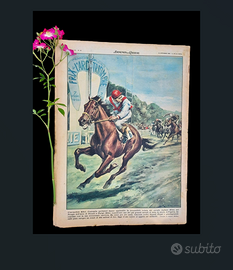 Copertina illustrata (retro): Trionfo di Ribot a Parigi: davanti a centomila spettatori, il cavallo italiano Ribot vince il Premio dell’Arco di Trionfo, chiudendo un’eccezionale carriera. In tre anni ha conquistato 16 Grandi Premi, guadagnando 164 milioni di lire. Oggi il suo valore supera il miliardo. (Disegno W. Molino)