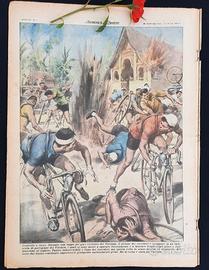 Controllo a fuoco. Durante una tappa del giro ciclistico del Vietnam, il plotone dei corridori è incappato in un'imboscata di partigiani del Vietmin, i quali si sono messi a sparare furiosamente e a lanciare bombe sugli atleti e sulle macchine al seguito. Panico indescrivibile e fuga dei corridori, ma questa volta in senso inverso al traguardo. Soltanto due hanno continuato imperterriti giungendo naturalmente primi. Ma la corsa è stata poi ripetuta. (Disegno di W. Molino)