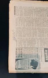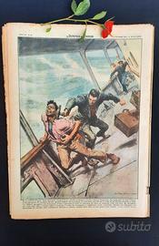La Domenica del Corriere 3 ottobre 1954 Anno 56, Numero 40 Rivista originale e completa, in lingua italiana. Copertina morbida, sovra copertine incluse. Copertina illustrata (fronte): Ricerca su avvistamento: a Roma è apparso un misterioso oggetto rossiccio a forma di mezzo sigaro con scia fumosa. Avvistato da migliaia di cittadini e rilevato dai radar aeroportuali, aveva un'antenna sporgente. Gli esperti escludono si tratti di un meteorite. (Disegno W. Molino) Copertina illustrata (retro): Lite a bordo: sulla motonave Andrea Gritti, diretta in Venezuela, due emigranti italiani litigano per motivi politici. Uno tenta di colpire l'altro con un martello, ma il rollio della nave lo sbilancia, deviando il colpo dalla testa alla spalla della vittima. (Disegno W. Molino) In questo numero: Come si arrivò ai mandati di cattura nell’affare Montesi Brividi in due Continenti per la ‘febbre dell’uranio’ Quelli che vanno in montagna anche a 80 anni Paolieri: il diritto del cane e altro ancora! Condizioni Ottime, con pagine un po’ ingiallite dal tempo. Le pagine potrebbero presentare piccoli strappi e macchie dovute all'uso e alla conservazione nel tempo. Sono presenti alcune annotazioni a penna, che tuttavia non compromettono la lettura (come da foto) La rosa visibile in foto è decorativa e non inclusa nella vendita. La spedizione della rivista verrà gestita con la massima priorità per garantirne l'invio nel minor tempo possibile. La nostra collezione di numeri originali ed unici della Domenica del Corriere (1931-1939) (1942-1943) (1948-1972) è disponibile per l'acquisto, sia singolarmente che in blocco. Per ulteriori informazioni contattateci. Domenica del Corriere, rivista storica originale con copertine illustrate da Walter Molino, De Gasperi e Beltrame. Perfetta per collezionisti, supplemento settimanale illustrato d’epoca del nuovo Corriere della Sera con pagine vintage di cronaca storica, arte e cultura. Inserto storico ideale per amanti di riviste antiche