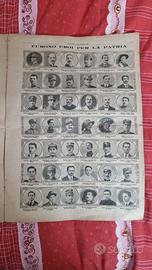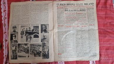 La Domenica del Corriere Rivista originale del 5-12 Dicembre 1915 Anno 17 - N. 49 Rarità per appassionati e collezionisti Seguono solo alcuni dei fatti descritti, illustrati e fotografati all'interno Illustrato in copertina (segue foto): Il bel colpo di un alpino: con un cappio ghermisce e fa precipitare una mitragliatrice austriaca con il servente. Illustrato nella retro copertina (segue foto): Sulle posizioni della nostra artiglieria da fortezza, mentre si regola il tiro contro le difese nemiche. Nelle pagine interne: Morti per la grandezza della patria (fotografie). Tre medaglie al valore. Fuga attraverso il deserto. Il Kronprinz e la guerra. I nostri ospiti.involontari. Un saccheggio organizzato ufficialmente dai tedeschi. La voce del mostro sta per tuonare. .e tanto altro ancora! La Domenica del Corriere è stato un popolare settimanale italiano fondato a Milano nel 1899 e chiuso nel 1989. Fortemente voluto da Luigi Albertini, allora direttore amministrativo del Corriere della Sera, apparve per la prima volta nelle edicole l'8 gennaio 1899 come supplemento illustrato del Corriere della Sera. Stampata in grande formato (sul modello del domenicale La Tribuna illustrata), aveva 12 pagine e veniva distribuita gratis agli abbonati del Corriere, oppure si poteva acquistare in edicola per 10 centesimi. Non fu concepito come periodico di informazione, per non risultare un doppione del quotidiano. Venne pensato come «settimanale degli italiani». Doveva scandire, come un calendario, le loro giornate liete, le loro tragedie, i loro fatti piccoli e grandi.