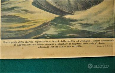 Interessante e “rara” copia originale d’epoca del periodo fascista “REPUBBLICA SOCIALE ITALIANA” del giornale “LA DOMENICA DEL CORRIERE” - numero 22 del 28 maggio 1944. Il periodico settimanale in argomento, tratta come argomento in copertina, l’attacco dei MAS della Decima Flottiglia al naviglio alleato sulla testa di ponte di Anzio o, più precisamente Nettunia, avvenuto pochi giorni prima dello sfondamento definitivo del fronte sud e della presa di Roma. Sull’ultima pagina, invece, è riportato un episodio delle operazioni antiguerriglia condotte in Piemonte nelle Valli di Lanzo. Bozzetti disegnati entrambi da Walter Molino. Per brevità verranno postate le foto della prima e dell’ultima pagina di ogni giornale, anche se tutte le pagine che lo compongono, si trovano in “OTTIME” condizioni di conservazione, con “normale” ingiallimento della carta in alcuni tratti, tuttavia senza strappi e/o mancanze. Nelle pagine interne sono riportate notizie varie e pubblicità, una pagina di storia che alle notizie più importanti affianca uno spaccato di vita dell’epoca. Misure: 390 mm x 290 mm.