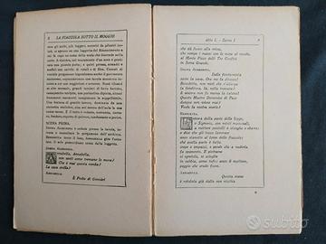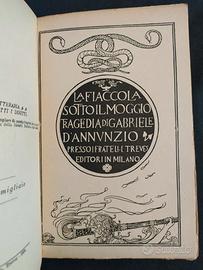 LA FIACCOLA SOTTO IL MOGGIO TRAGEDIA (Gabriele D'Annunzio) Treves 1912, Undicesimo migliaio. Testate e finalini xilografici di A.De Carolis, brossura copertina di Adolfo de Carolis. Rara edizione della tragedia di Gabriele D'Annunzio. Ottimo stato, copertina con lievissimi segni del tempo e lievi fioriture al dorso, per il resto volume integro e ben conservato. Altre foto su richiesta. Spedizione immediata.