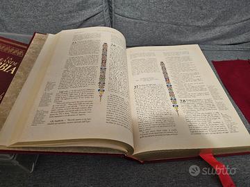 Un'edizione prestigiosa con oltre 300 miniature dei più grandi maestri italiani del '400, tratte dai più famosi codici rinascimentali custoditi nella Biblioteca Apostolica Vaticana (Bibbia del Belbello da Pavia del 1434, Codici Urbinati del 1476-1478) riprodotte a sei colori e oro su carta speciale pergamenata. L'opera, nella traduzione della "Nuovissima versione dai testi originali"- è impaginata su due colonne con brevi note marginali e presenta Introduzioni generali e Presentazioni dei singoli 73 libri, sussidi e schede informative, Tavole cronologiche e carte geo-topografiche del mondo biblico. La rilegatura è in Balacron con impressioni in oro, doratura sul taglio delle pagine e fodera in velluto. L'edizione è custodita in uno speciale cofanetto in plexiglass che diventa un originale leggio espositore.