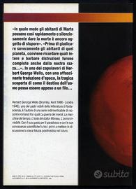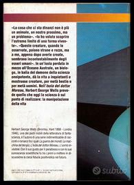 Herbert George Wells: • LA GUERRA DEI MONDI (Romanzo) - 160 pagine «In quale modo gli abitanti di Marte possano così rapidamente e silenziosamente dare la morte è ancora oggetto di stupore». «Prima di giudicare severamente gli abitanti di quel pianeta, conviene ricordare quali intere e barbare distruzioni furono compiute anche dalla nostra razza...». In uno dei capolavori di Herbert George Wells, con una affascinante traduzione d'epoca, la tragica scoperta di come il destino dell'uomo posa essere appeso a un filo... • L'ISOLA DEL DOTTOR MOREAU (Romanzo) - 128 pagine «La cosa che ci sta dinanzi non è più un animale, un nostro prossimo, ma un problema». «Io ho voluto scoprire l'estremo limite di una forma vivente». «Queste creature, quando le osservate, paiono strane e rozze, ma a me, appena dopo averle create, sembrano incontestabilmente degli esseri umani». In un'isola perduta in mezzo all'Oceano Australe, un biologo, in balìa del demone della scienza onnipotente, dà la vita a inquietanti e mostruose creature, per metà bestie e per metà uomini. Nell'«Isola del dottor Moreau», Herbert George Wells prevede quello che oggi la scienza è sul punto di realizzare: la manipolazione della vita. Libera Informazione Editrice ("Avvenimenti"), 1998 collana "I libri di Avvenimenti" • Fuori commercio Brossure con copertine illustrate — ▶️ CONDIZIONI: Libri nuovi (mai letti né sfogliati) con lievi segni del tempo alle copertine (v. foto). — Herbert Gerorge Wells (Bromley, Kent 1866 - Londra 1946), uno dei padri nobili della letteratura di fantascienza, è l'autore di una serie indimenticabile di racconti e romanzi fra i quali «La guerra dei mondi», «La macchina del tempo», «L'isola del dottor Moreau», «L'uomo invisibile». Con il suo gusto per il paradosso e con le sue conoscenze scientifiche fu tra i primi a mettere in discussione la cieca fiducia nel futuro.