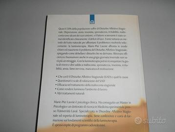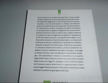 Tre libri che dimostrano quanto sia importante la luce solare per la salute ed il benessere della Vita. La sua carenza, infatti, produce un deficit di vitamina D, necessaria per il regolare svolgimento di una serie di importanti processi in tutto il corpo (e per tutti gli esseri viventi). Questa vitamina è in grado di migliorare la qualità e l'aspettativa di vita dei malati di cancro, ma soprattutto di agire in maniera determinante a livello di prevenzione. E' efficace anche per combattere il rachitismo e il diabete, rallentare i processi di atrofia ossea, rinforzare la muscolatura, stimolare il sistema immunitario, produrre antibiotici endogeni aiutando a combattere gli agenti patogeni, proteggere le cellule nervose, aiutare ad abbassare la pressione sanguigna. Inoltre è utile per affrontare depressione, ansia, insonnia, spossatezza, irritabilità, malinconia (alcuni dei sintomi del disturbo affettivo stagionale o SAD), il cui fattore scatenante è stato ormai identificato chiaramente: il deficit di luce. Esiste tuttavia un metodo del tutto naturale per affrontare il problema e risolverlo velocemente: la luminoterapia. Luceterapia, luminoterapia: gioia di vivere e addio a senso di tristezza, stanchezza, insonnia, nervosismo, ansia, fame nervosa, mancanza di motivazione. La luce del Sole è la più potente medicina che la natura abbia mai regalato all'uomo. 1) "La luce che cura", Fabio Marchesi; 2) "Il sole che guarisce. Le incredibili proprietà terapeutiche della vitamina D ", William B. Grant, Jörg Spitz; 3) "Luminoterapia: Il bagno di luce che dona energia e buonumore - Un metodo naturale per curare il disturbo affettivo stagionale", Marie-Pier Lavoie." Libri come nuovi, non fruiti (magazzino). Spedisco anche con pacchetto raccomandato. (€ 5,00).