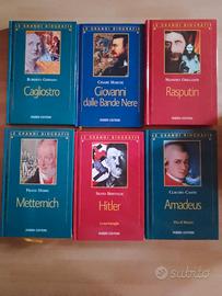 I volumi Lucrezia Borgia, Nerone e Gengiz-Khan con sottolineature a penna.