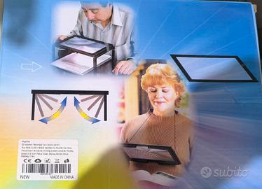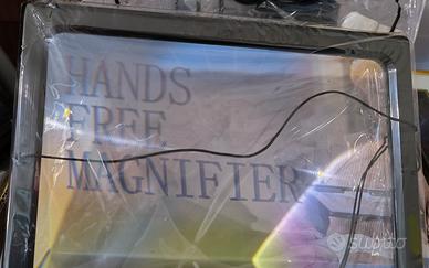 Lente d'ingrandimento grande completa di gambe, per poter essere utilizzata poggiata sul tavolo o altre superfici, e di collanina per poter essere portata al collo.