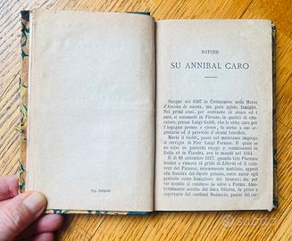 “Lettere scelte” di Annibal Caro Casa Editrice GUIGONI, Milano 1874 Si tratta di una raccolta di lettere di Caro, figura importante del Rinascimento italiano, noto anche per la traduzione dell’Eneide. Le lettere sono apprezzate per lo stile elegante e raffinato, il valore storico e linguistico, le testimonianze della vita culturale del XVI secolo Legatura in mezza pelle con dorature al dorso (bella e decorativa) Carta ancora abbastanza pulita Angoli leggermente consumati Formato elegante, tipico da collezione