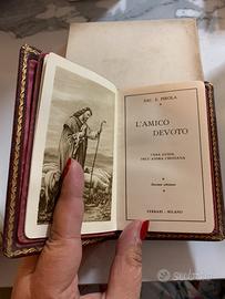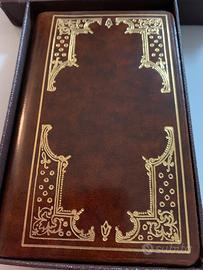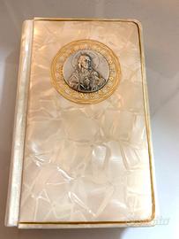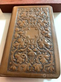Piccolo libro con copertina in pelle e tessuto pregiato all’interno, con tasche porta rosario.