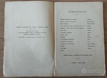 Libretto operistico della Madama Butterfly di G.Puccini datato 1904. Edizioni Ricordi. Tenuto molto bene visti i 120 anni di età. Per chi lo desidera posso spedire con costo a carico dell'acquirente.