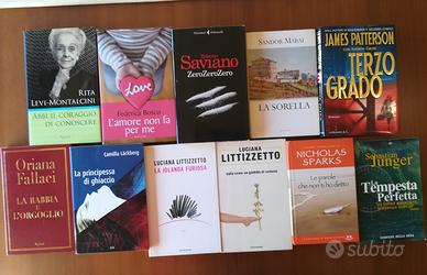 Oriana Fallaci - La rabbia e l'orgoglio, 3 euro - Lettera a un bambino mai nato - Bur, 3 euro - Quel giorno sulla luna, 4 euro - Il mio cuore è più stanco della mia voce, 4 euro - Insciallah - Rizzoli, a 8 euro Alessandro Baricco - City, 5 euro Eros Ramazzotti - Lo giuro - Raccontato da Luca Bianchini - Mondadori, 5 euro Federico Moccia - Ho voglia di te, 3 euro Federico Moccia - Tre metri sopra il cielo, 3 euro Federico Moccia - Scusa ma ti chiamo amore, 3 euro. Chicca Visconti - Sognerò Riccardo Scamarcio - Open Game, 3 euro. Tehmina Durrani - Schiava di mio marito- Fabbri Editori, 3 euro Andrea Vitali - Le belle Cece, 6 euro La modista, 5 euro La verità della suora storta, 6 euro.Galeotto fu il collier, a 5 euro. Rita Levi-Montalcini - Tempo di mutamenti, 6 euro Rita Levi- Montalcini - Elogio dell'imperfezione, 7 euro. Rita Levi - Montalcini - Abbi il coraggio di conoscere - Rizzoli, 6 euro. Federica Bosco - L'amore non fa per me, 3 euro. Federica Bosco - Mi piaci da morire, 3 euro Roberto Saviano ZeroZeroZero -Feltrinelli, 3 euro. Gomorra, a 4 euro. La paranza dei bambini, a 5 euro Sandor Marai - La sorella, 4 euro. James Patterson - Terzo Grado, 5 euro. James Patterson - Il diario di Suzanne, 5 euro. Camilla Läckberg Il domatore di leoni, 4 euro. Camilla Läckberg La sirena, vintage, 4 euro. Camilla Läckberg La principessa di ghiaccio, 4 euro. Camilla Lackberg Il gioco della notte, Mondolibri. vendo a 3 euro Luciana Littizzetto La Jolanda furiosa Mondadori, 3 euro. Sola come un gambo di sedano Dolori del giovane Walter, 3 euro. La principessa sul pisello - La biblioteca di Donna Moderna, 3 euro. Nicholas Sparks Come un uragano, OGGI , 3 euro Come la prima volta, a 3 euro Le parole che non ti ho detto DM 3 euro Ricordati di guardare la luna, 3 euro. I passi dell'amore, a 3 euro Sebastian Junger - La tempesta perfetta - Corriere della sera 4 euro. Spedizione in Italia, fino a 2 kg con piego di libri non tracciato euro 1,50 con raccomandata 5 euro.