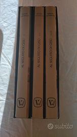 Libri con copertina in similpelle con sovraccoperta, contenuti in un cofanetto rigido.
