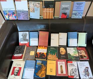 Filosofia del linguaggio (bibliotheca), storia della filosofia contemporanea (cambiano, mori), storia della filosofia moderna (massimo mori), storia dell'arte (gonbrich), che cos'è la filosofia antica (Pierre hadot), profilo di storia del pensiero economico (screpanti, zamagni), Etica nicomachea (Aristotele), Politica (Aristotele), protagora (Platone), il dubbio di Pirrone (giovanni reale), dell'origine (Eraclito), Pitagora e i misteri (Jean mallinger), sulla natura (Parmenide), testimonianze e frammenti (Gorgia), Empedocle (Giorgio colli), frammenti e testimonianze (Anassagora, Bompiani), marco Aurelio pensieri (Bompiani) / Bertrand Russell (la conquista della felicità, l'elogio dell'ozio) / Victor Frankl (l'uomo in cerca di senso, la sofferenza di una vita senza senso, logoterapia e analisi esistenziale, alla ricerca di un significato della vita) / Total Freedom (krishnamurti), nulla da cercare (thich nhat hanh), lo zen e l'arte della manutenzione della motocicletta (robert pirsig), Nietzsche (ecce homo, così parlò Zarathustra, Libro unico che contiene: la nascita della tragedia, il viandante e la sua ombra, la gaia scienza. Altro libro che contiene: genealogia della morale, crepuscolo degli idoli, l'anticristo e altri), La città del sole (Tommaso campanella), La dotta ignoranza (Nicola Cusano), La scienza nuova (vico, Laterza), Candido e l'illuminismo (voltaire), trattato sulla tolleranza (voltaire) origine della diseguaglianza (Rousseau)