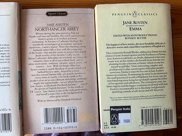 Vendo diversi libri di Jane Austen. In lingua inglese: "Northanger Abbey", "Emma", "Mansfield Park", "Sense and Sensibility". In lingua italiana: "Orgoglio e Pregiudizio" e "Persuasione". Il prezzo sotto si riferisce soltanto a "Emma", chiedere il prezzo di quello a cui si è eventualmente interessati.