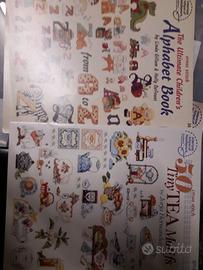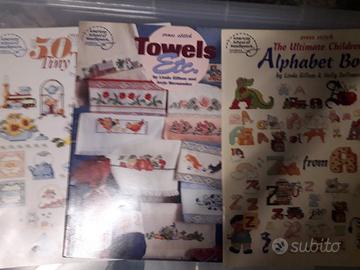 Libri americani, francesi DMC e italiani con schemi per Punto Croce. Schemi a colori, schemi in bianco e nero per alfabeti semplici o complessi, sampler da appendere o piccoli motivi per bavaglini e asciugamani, guanti o presine.
